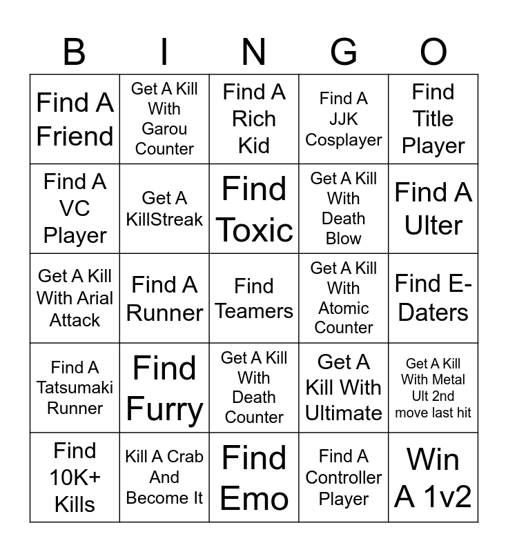 This bingo card has 25 words: Find Furry, Find Emo, Find Toxic, Find 10K+ Kills, Find Title Player, Find A Friend, Find A VC Player, Get A Kill With Garou Counter, Get A Kill With Atomic Counter, Get A Kill With Death Counter, Get A Kill With Death Blow, Get A Kill With Arial Attack, Get A Kill With Ultimate, Get A Kill With Metal Ult 2nd move last hit, Get A KillStreak, Win A 1v2, Find E-Daters, Find A Rich Kid, Find A Ulter, Find A Runner, Find Teamers, Kill A Crab And Become It, Find A Tatsumaki Runner, Find A JJK Cosplayer and Find A Controller Player.