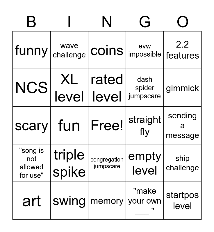 This bingo card has a free space and 24 words: triple spike, swing, rated level, art, 2.2 features, funny, NCS, wave challenge, straight fly, congregation jumpscare, dash spider jumpscare, scary, empty level, ship challenge, XL level, "make your own ___ ", sending a message, coins, gimmick, fun, startpos level, "song is not allowed for use", evw impossible and memory.