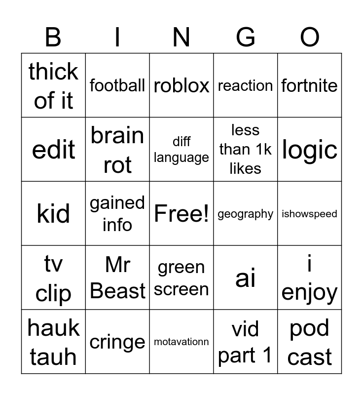 This bingo card has a free space and 24 words: Mr Beast, cringe, diff language, hauk tauh, fortnite, thick of it, edit, football, geography, green screen, less than 1k likes, kid, ai, i enjoy, brain rot, vid part 1, ishowspeed, roblox, logic, gained info, pod cast, tv clip, reaction and motavationn.