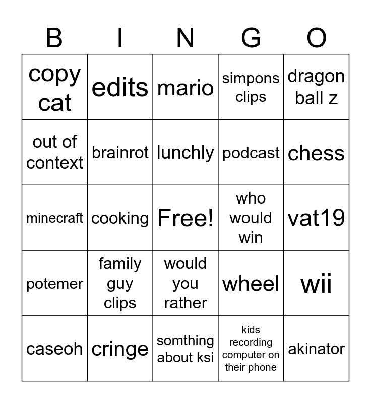 This bingo card has a free space and 24 words: family guy clips, cringe, lunchly, caseoh, dragon ball z, copy cat, out of context, edits, who would win, would you rather, podcast, minecraft, wheel, wii, brainrot, kids recording computer on their phone, vat19, mario, chess, cooking, akinator, potemer, simpons clips and somthing about ksi.