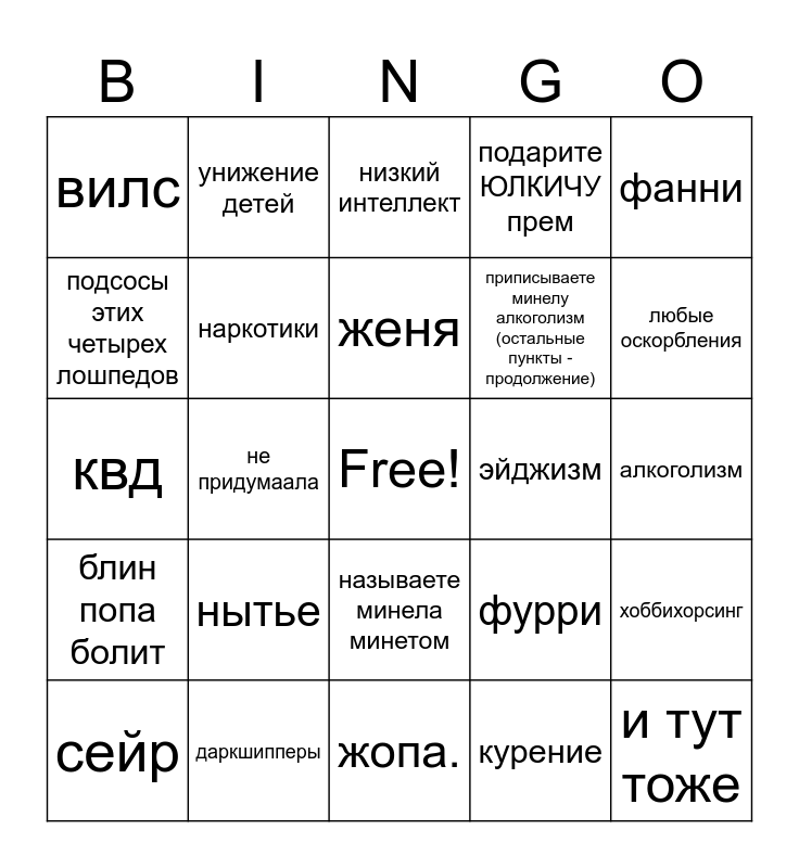 This bingo card has a free space and 24 words: нытье, даркшипперы, женя, сейр, фанни, вилс, подсосы этих четырех лошпедов, унижение детей, эйджизм, называете минела минетом, приписываете минелу алкоголизм (остальные пункты - продолжение), квд, фурри, хоббихорсинг, наркотики, курение, алкоголизм, низкий интеллект, любые оскорбления, не придумаала, и тут тоже, блин попа болит, подарите ЮЛКИЧУ прем and жопа..