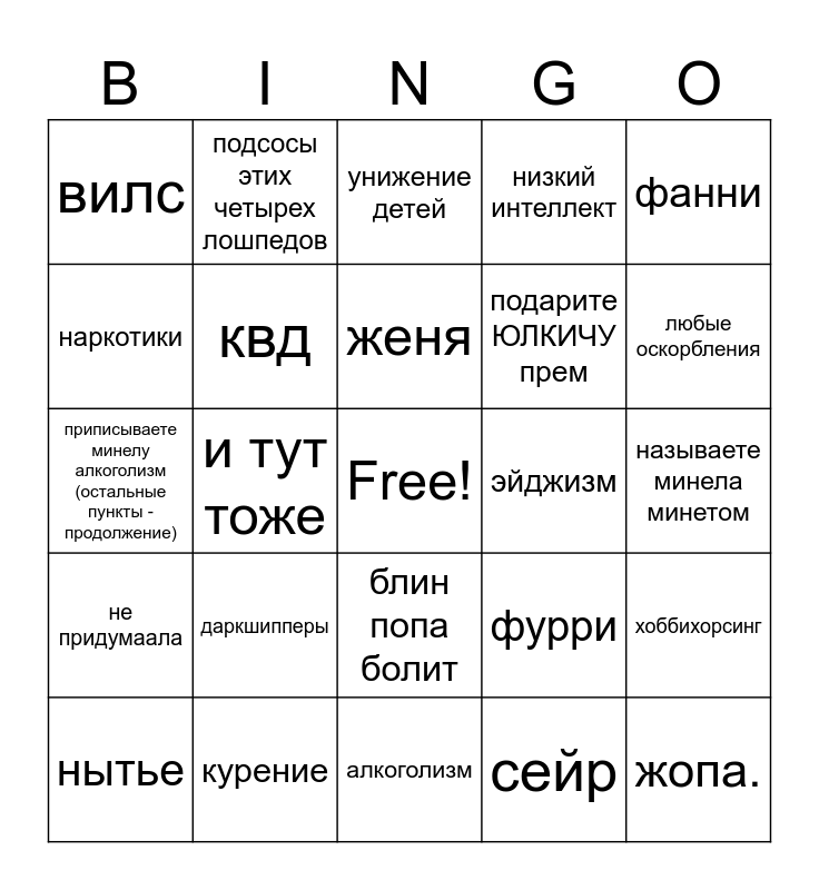 This bingo card has a free space and 24 words: нытье, даркшипперы, женя, сейр, фанни, вилс, подсосы этих четырех лошпедов, унижение детей, эйджизм, называете минела минетом, приписываете минелу алкоголизм (остальные пункты - продолжение), квд, фурри, хоббихорсинг, наркотики, курение, алкоголизм, низкий интеллект, любые оскорбления, не придумаала, и тут тоже, блин попа болит, подарите ЮЛКИЧУ прем and жопа..