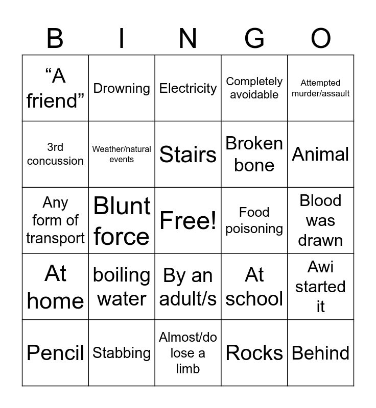 This bingo card has a free space and 24 words: boiling water, Stabbing, Stairs, Pencil, Attempted murder/assault, “A friend”, 3rd concussion, Drowning, Food poisoning, By an adult/s, Broken bone, Any form of transport, At school, Awi started it, Weather/natural events, Rocks, Blood was drawn, Electricity, Animal, Blunt force, Behind, At home, Completely avoidable and Almost/do lose a limb.