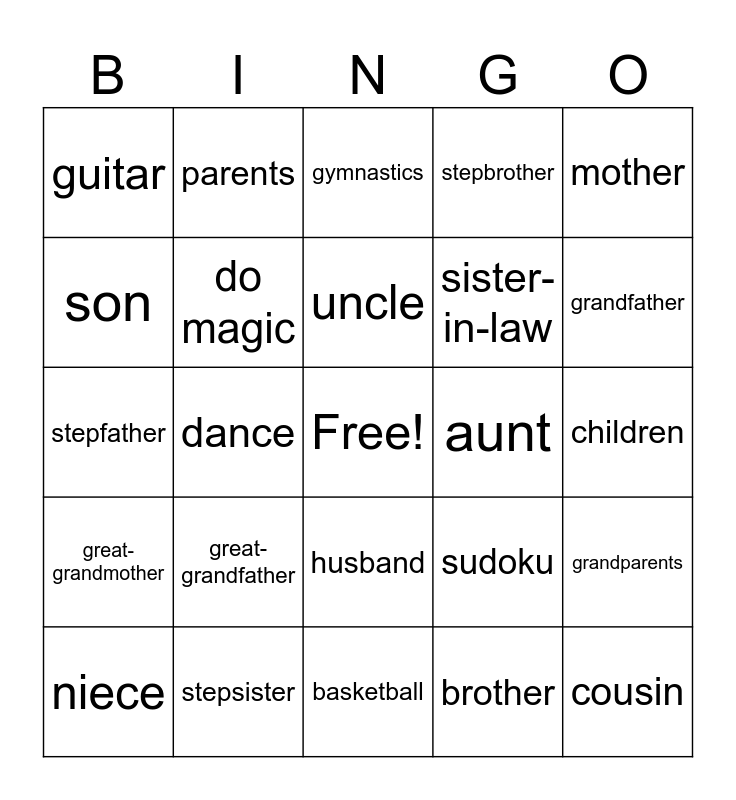 This bingo card has a free space and 31 words: basketball, butterfly, dance, dive, guitar, gymnastics, do magic, sudoku, aunt, brother, children, cousin, daughter, father, grandfather, grandmother, grandparents, great-grandfather, great-grandmother, husband, mother, nephew, niece, parents, sister-in-law, son, stepbrother, stepfather, stepsister, uncle and wife.