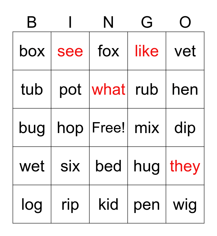 This bingo card has a free space and 29 words: log, dog, hop, cop, box, fox, pot, six, mix, rip, dip, wig, kid, pen, hen, red, bed, wet, vet, bug, hug, mug, rub, tub, like, see, they, what and will.