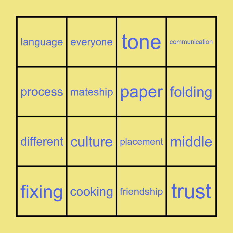 This bingo card has 37 words: airplane, procedure, end, paper, list, timeline, folding, beginning, process, how?, middle, communication, fixing, friendship, mateship, trust, resources, tone, stew, cooking, language, culture, sequence, audience, gentlemen, inclusive, everyone, humour, funny, crocodile, wise, colour, placement, eye-catching, similar, different and font.