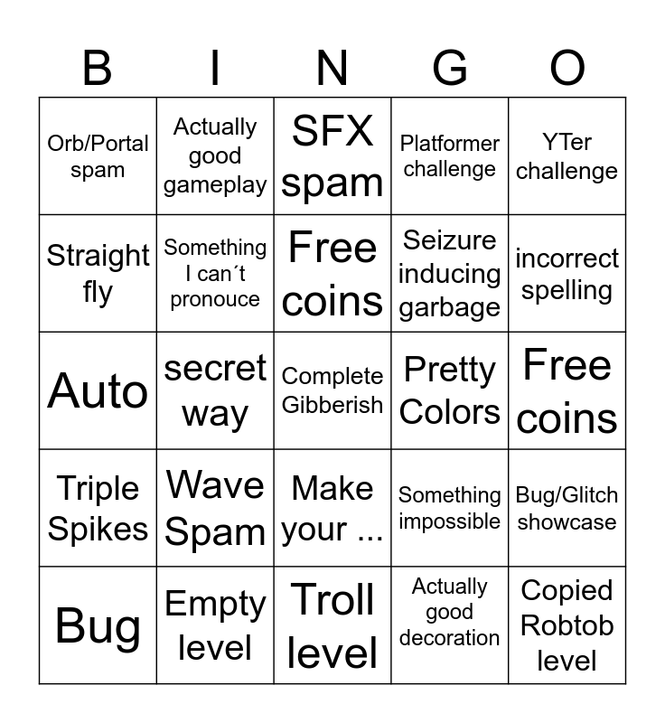 This bingo card has a free space and 24 words: Wave Spam, Empty level, Free coins, Bug, YTer challenge, Orb/Portal spam, Straight fly, Actually good gameplay, Pretty Colors, Make your ..., Seizure inducing garbage, Auto, Something impossible, Bug/Glitch showcase, Something I can´t pronouce, Actually good decoration, Free coins, SFX spam, incorrect spelling, secret way, Copied Robtob level, Triple Spikes, Platformer challenge and Troll level.