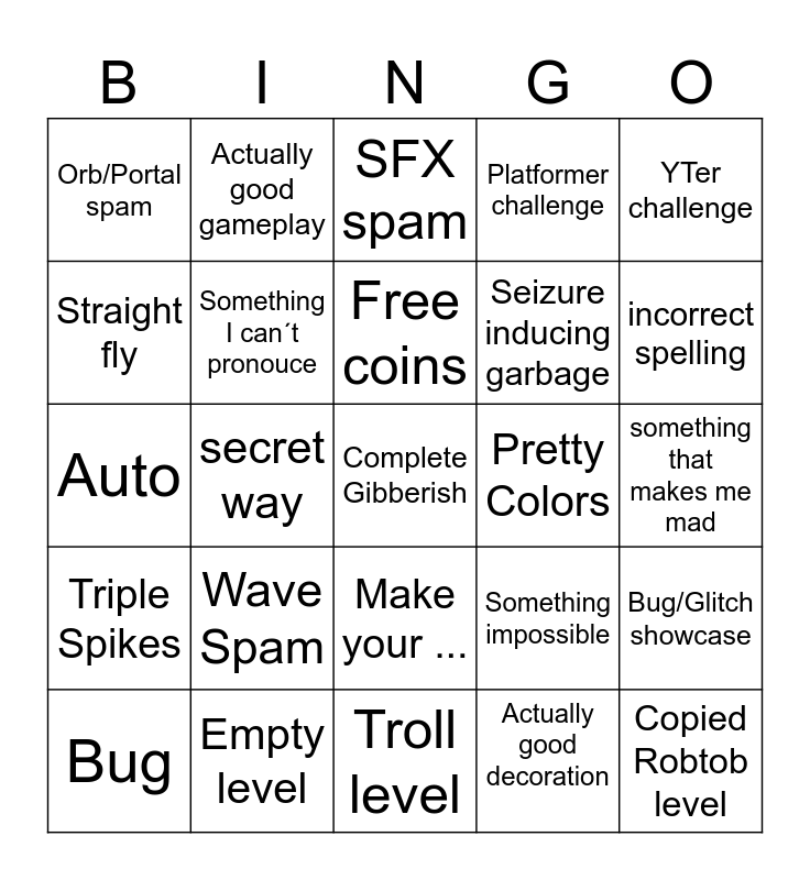 This bingo card has a free space and 24 words: Wave Spam, Empty level, Free coins, Bug, YTer challenge, Orb/Portal spam, Straight fly, Actually good gameplay, Pretty Colors, Make your ..., Seizure inducing garbage, Auto, Something impossible, Bug/Glitch showcase, Something I can´t pronouce, Actually good decoration, something that makes me mad, SFX spam, incorrect spelling, secret way, Copied Robtob level, Triple Spikes, Platformer challenge and Troll level.