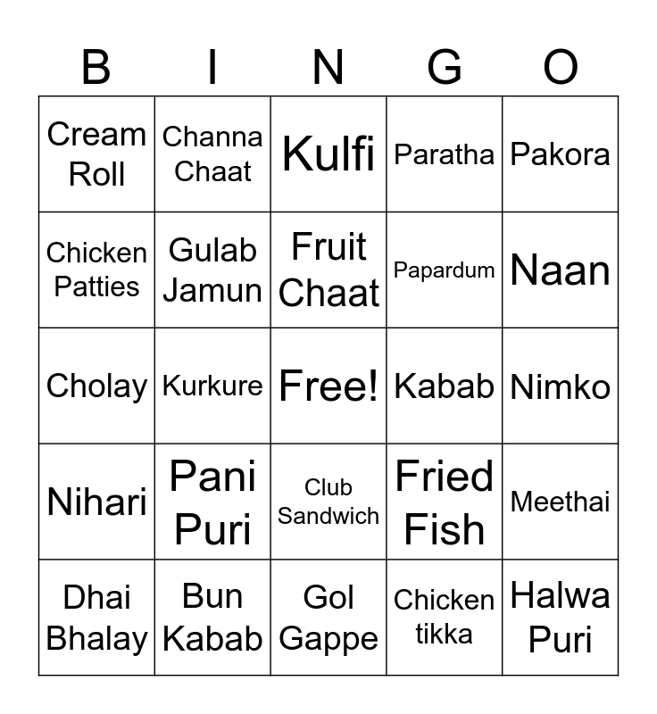 This bingo card has a free space and 25 words: Pani Puri, Gol Gappe, Fruit Chaat, Dhai Bhalay, Pakora, Cream Roll, Chicken Patties, Channa Chaat, Kabab, Club Sandwich, Papardum, Cholay, Fried Fish, Meethai, Gulab Jamun, Jalebi, Nimko, Kulfi, Naan, Kurkure, Halwa Puri, Bun Kabab, Nihari, Paratha and Chicken tikka.