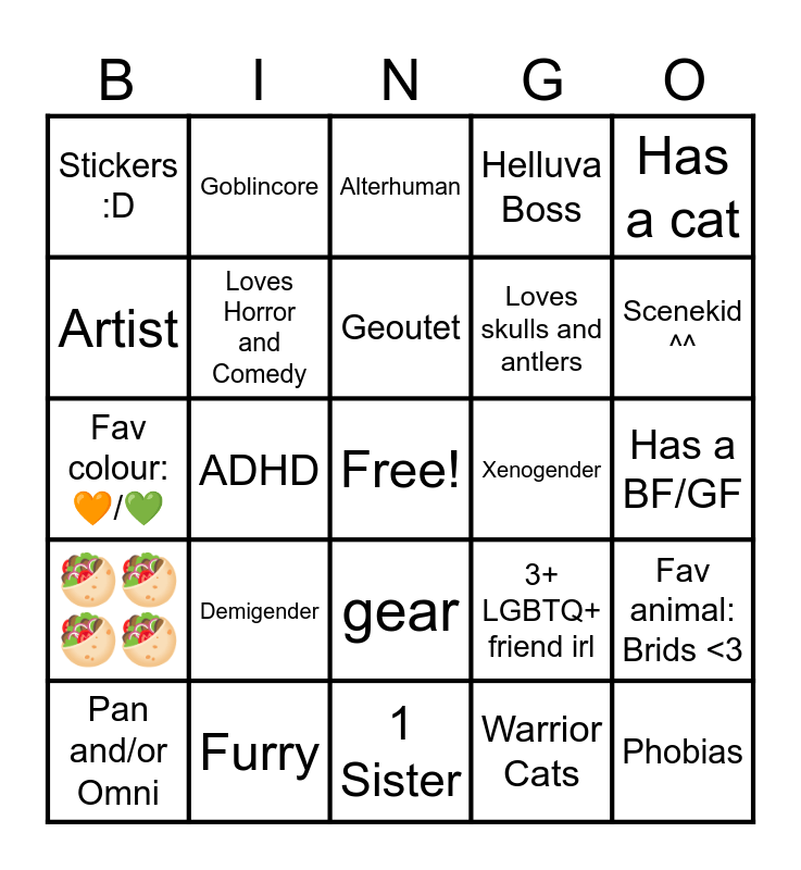 This bingo card has a free space and 24 words: Pan and/or Omni, Demigender, Geoutet, Warrior Cats, Has a cat, Stickers :D, Goblincore, Alterhuman, Xenogender, Has a BF/GF, Fav colour: ๐งก/๐, Loves Horror and Comedy, 3+ LGBTQ+ friend irl, Fav animal: Brids <3, Artist, Furry, 1 Sister, Helluva Boss, Scenekid ^^, ๐ฅ๐ฅ๐ฅ๐ฅ, ADHD, gear, Loves skulls and antlers and Phobias.