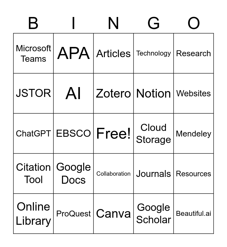 This bingo card has a free space and 24 words: Google Docs, ProQuest, Zotero, Online Library, Research, Microsoft Teams, JSTOR, APA, Cloud Storage, Collaboration, Notion, ChatGPT, Journals, Resources, AI, Google Scholar, Mendeley, Articles, Websites, EBSCO, Beautiful.ai, Citation Tool, Technology and Canva.