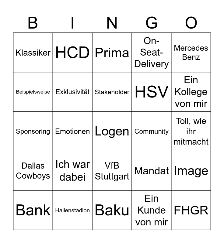 This bingo card has a free space and 24 words: Ich war dabei, Hallenstadion, Stakeholder, Bank, Mercedes Benz, Klassiker, Beispielsweise, HCD, Community, VfB Stuttgart, HSV, Sponsoring, Mandat, Image, Exklusivität, Ein Kunde von mir, Toll, wie ihr mitmacht, Prima, Ein Kollege von mir, Emotionen, FHGR, Dallas Cowboys, On-Seat-Delivery and Baku.