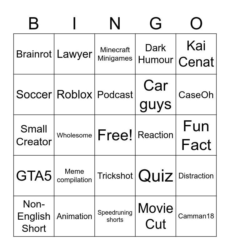 This bingo card has a free space and 24 words: Meme compilation, Animation, Podcast, Non-English Short, Kai Cenat, Brainrot, Soccer, Lawyer, Reaction, Trickshot, Car guys, Small Creator, Quiz, Distraction, Roblox, Movie Cut, Fun Fact, Minecraft Minigames, CaseOh, Wholesome, Camman18, GTA5, Dark Humour and Speedruning shorts.