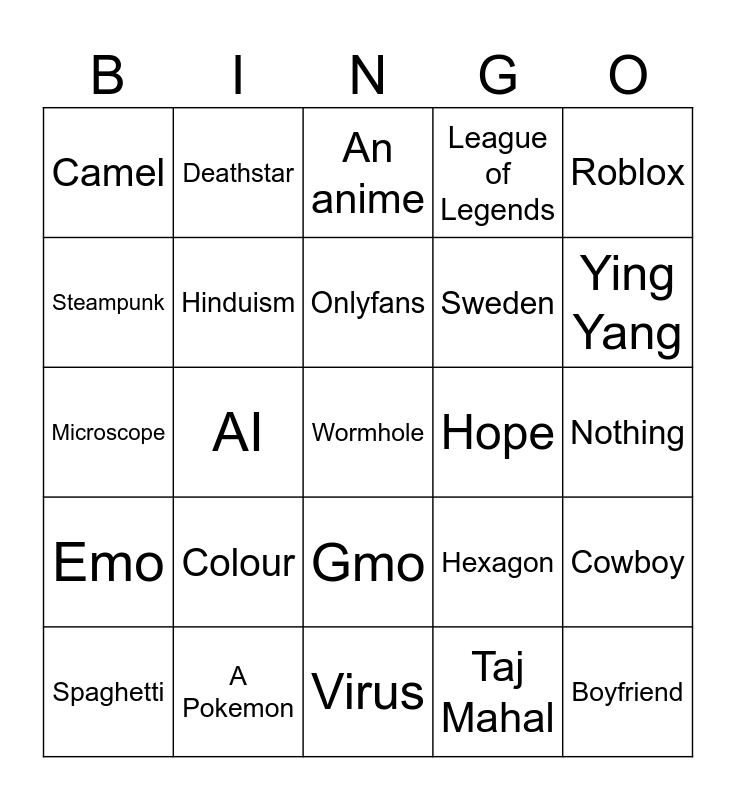 This bingo card has a free space and 24 words: Colour, A Pokemon, Onlyfans, Spaghetti, Roblox, Camel, Steampunk, Deathstar, Hope, Gmo, Sweden, Microscope, Hexagon, Cowboy, Hinduism, Taj Mahal, Nothing, An anime, Ying Yang, AI, Boyfriend, Emo, League of Legends and Virus.