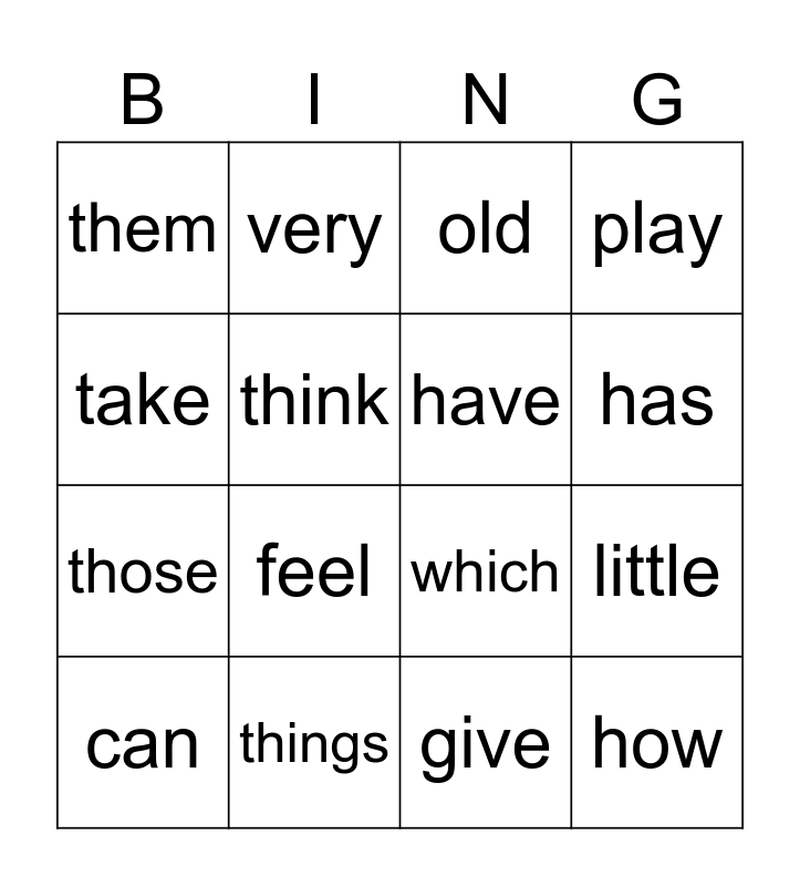 This bingo card has 16 words: things, little, old, them, those, very, which, give, take, think, can, play, feel, has, have and how.