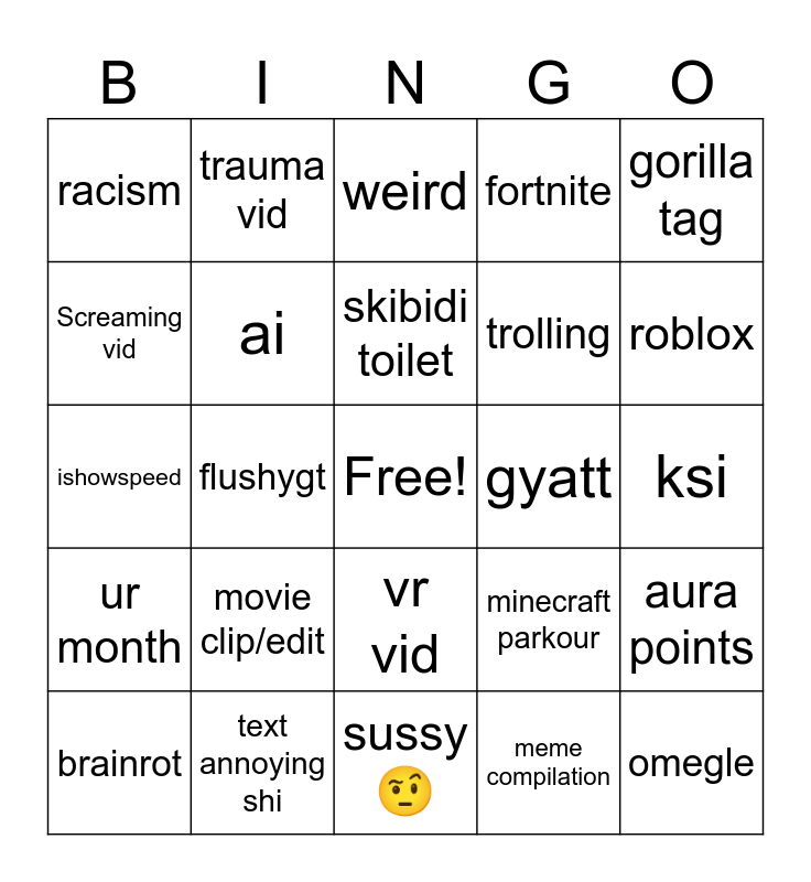 This bingo card has a free space and 24 words: brainrot, movie clip/edit, skibidi toilet, meme compilation, gorilla tag, racism, trauma vid, weird, gyatt, ksi, ishowspeed, ai, minecraft parkour, aura points, Screaming vid, text annoying shi, sussy🤨, fortnite, roblox, ur month, flushygt, vr vid, trolling and omegle.