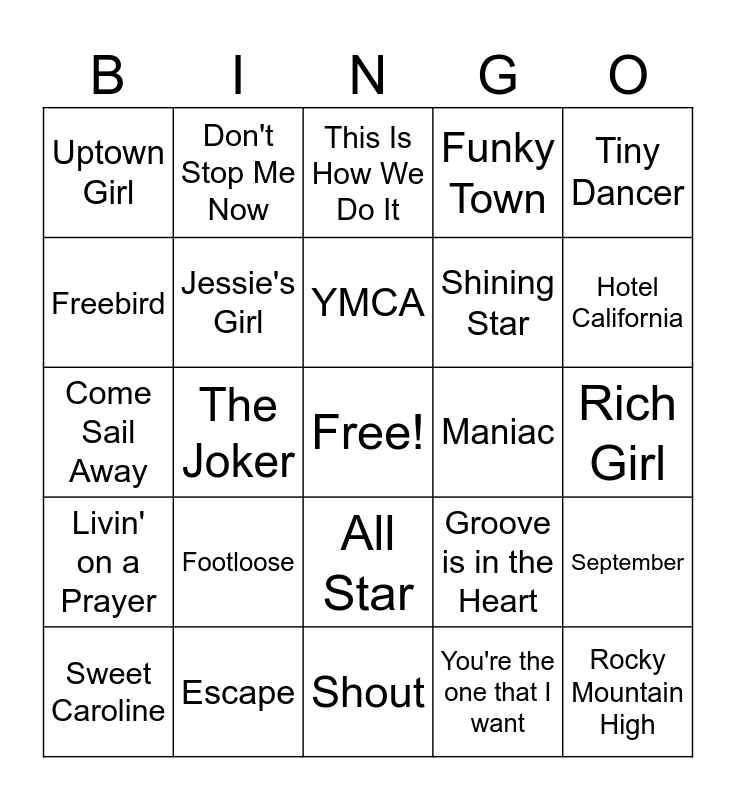 This bingo card has a free space and 24 words: Footloose, Escape, YMCA, Sweet Caroline, Tiny Dancer, Uptown Girl, Freebird, Don't Stop Me Now, Maniac, All Star, Shining Star, Come Sail Away, Groove is in the Heart, September, Jessie's Girl, You're the one that I want, Rich Girl, This Is How We Do It, Hotel California, The Joker, Rocky Mountain High, Livin' on a Prayer, Funky Town and Shout.