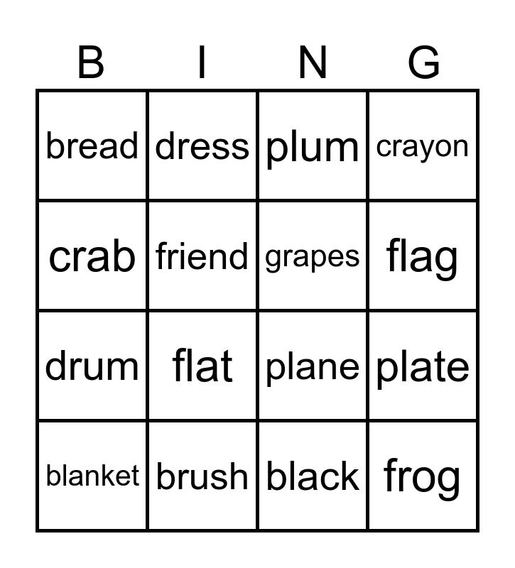 This bingo card has 20 words: blanket, blue, plum, plate, flower, flat, black, crayon, drum, dress, plane, flag, bread, brush, grapes, grass, crab, friend, frisbee and frog.