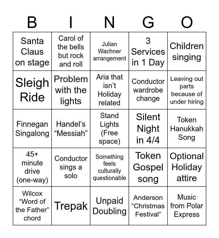 This bingo card has a free space and 24 words: Conductor sings a solo, Trepak, Aria that isn’t Holiday related, Wilcox “Word of the Father” chord, Children singing, Santa Claus on stage, Sleigh Ride, Carol of the bells but rock and roll, Silent Night in 4/4, Something feels culturally questionable, Conductor wardrobe change, Finnegan Singalong, Token Gospel song, Optional Holiday attire, Problem with the lights, Anderson “Christmas Festival”, Token Hanukkah Song, Julian Wachner arrangement, Leaving out parts because of under hiring, Handel’s “Messiah”, Music from Polar Express, 45+ minute drive (one-way), 3 Services in 1 Day and Unpaid Doubling.