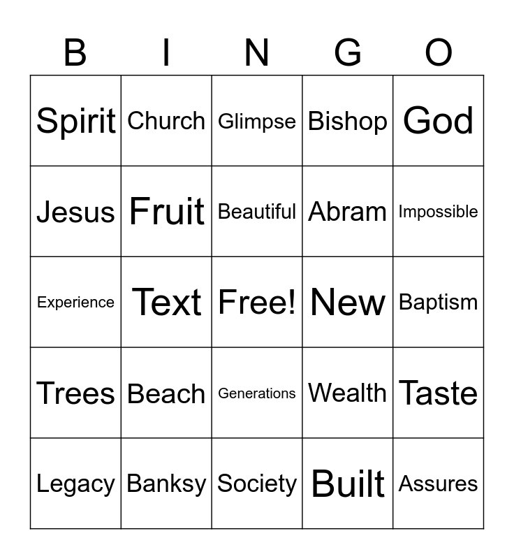 This bingo card has a free space and 24 words: Beach, Banksy, Beautiful, Legacy, God, Spirit, Jesus, Church, New, Generations, Abram, Experience, Wealth, Taste, Fruit, Built, Baptism, Glimpse, Impossible, Text, Assures, Trees, Bishop and Society.