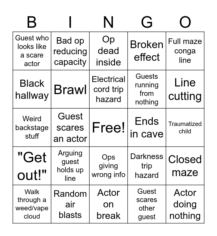 This bingo card has a free space and 50 words: <4 actors in a maze, Actor doing nothing, Actor flirting, Actor on break, Arguing guest holds up line, Audio loop repeats, Bad op reducing capacity, Bad screen, Black hallway, Bodily fluid, Brawl, Broken effect, Closed maze, Darkness trip hazard, Death metal ear rape, "Please keep moving!", Electrical cord trip hazard, Ends in cave, Extremely annoying kids, Full maze conga line, Guest scares an actor, Guest scares other guest, Guest who looks like a scare actor, Guests running from nothing, Head injury danger, Intentional "good" smell, Line cutting, Missing actor from trigger, Op dead inside, Ops giving wrong info, Out of context prop, Outdated graphics, Over the occupancy limit, Pool of unknown liquid, Random air blasts, Security involvement, Shaker can, Someone says "Boo!", Spirit Halloween, Traumatized child, Unintentional bad smell, Unnecessary long switch backs, Unthemed IP branding, Visible speaker, Walk through a weed/vape cloud, Weird backstage stuff, Worst conversation to overhear, Wrong IP, "Get out!" and "Help me!".