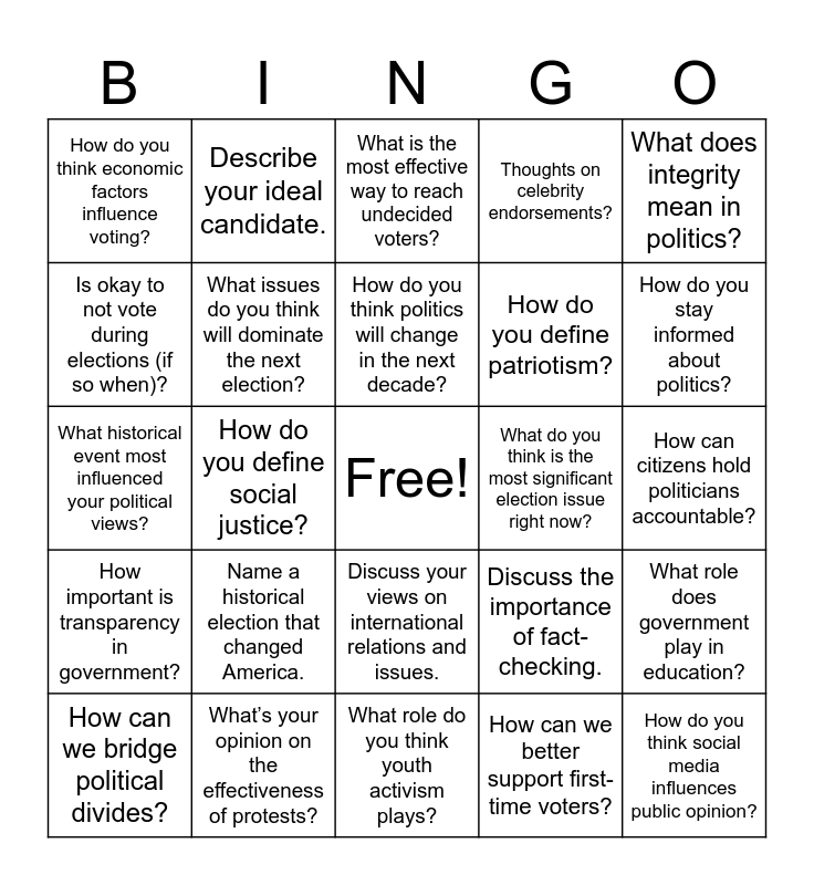 This bingo card has a free space and 24 words: Name a historical election that changed America., What’s your opinion on the effectiveness of protests?, How do you think politics will change in the next decade?, How can we bridge political divides?, What does integrity mean in politics?, How do you think economic factors influence voting?, Is okay to not vote during elections (if so when)?, Describe your ideal candidate., What do you think is the most significant election issue right now?, Discuss your views on international relations and issues., How do you define patriotism?, What historical event most influenced your political views?, Discuss the importance of fact-checking., What role does government play in education?, What issues do you think will dominate the next election?, How can we better support first-time voters?, How can citizens hold politicians accountable?, What is the most effective way to reach undecided voters?, How do you stay informed about politics?, How do you define social justice?, How do you think social media influences public opinion?, How important is transparency in government?, Thoughts on celebrity endorsements? and What role do you think youth activism plays?.