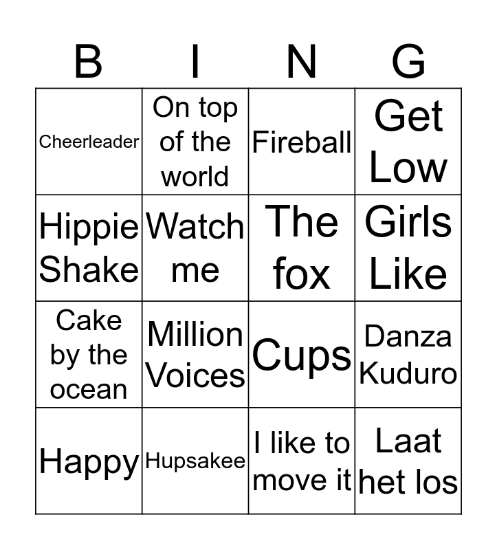 This bingo card has a free space and 16 words: Hupsakee, Danza Kuduro, Fireball, Cheerleader, Cake by the ocean, On top of the world, Laat het los, I like to move it, Hippie Shake, Watch me, Happy, Get Low, Million Voices, Girls Like, The fox and follow the sun.