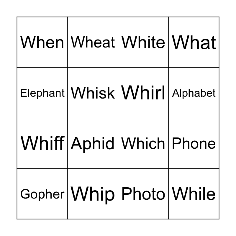 This bingo card has 22 words: Whip, Whale, Wheat, Wheel, Whisk, Whirl, When, White, Which, While, Whiff, What, Graph, Phase, Photo, Dolphin, Phone, Gopher, Aphid, Elephant, Alphabet and Sphere.