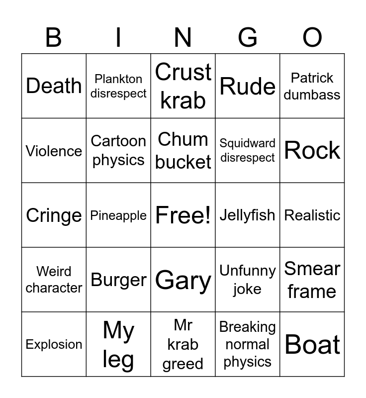This bingo card has a free space and 24 words: Burger, My leg, Chum bucket, Explosion, Patrick dumbass, Death, Violence, Plankton disrespect, Jellyfish, Gary, Squidward disrespect, Cringe, Unfunny joke, Smear frame, Cartoon physics, Breaking normal physics, Realistic, Crust krab, Rock, Pineapple, Boat, Weird character, Rude and Mr krab greed.