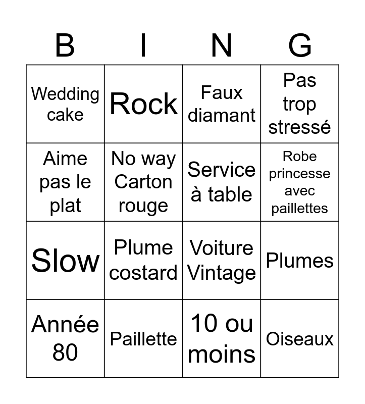 This bingo card has 16 words: Paillette, Plumes, Faux diamant, Wedding cake, Slow, Rock, Voiture Vintage, 10 ou moins, Aime pas le plat, No way Carton rouge, Année 80, Pas trop stressé, Plume costard, Robe princesse avec paillettes, Service à table and Oiseaux.
