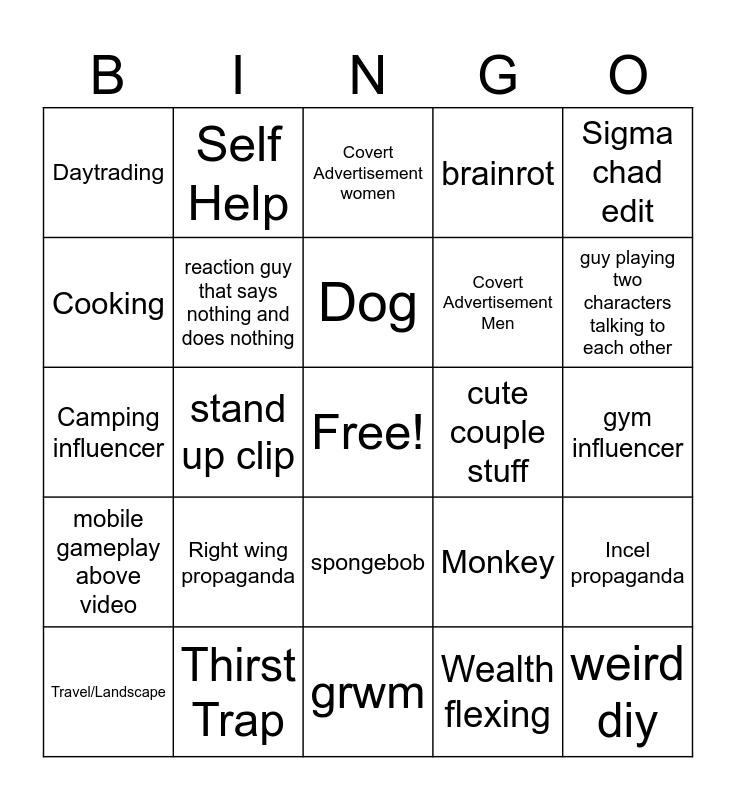 This bingo card has a free space and 24 words: Right wing propaganda, Thirst Trap, Dog, Travel/Landscape, Sigma chad edit, Daytrading, Cooking, Self Help, cute couple stuff, spongebob, Covert Advertisement Men, Camping influencer, Monkey, Incel propaganda, reaction guy that says nothing and does nothing, Wealth flexing, gym influencer, Covert Advertisement women, guy playing two characters talking to each other, stand up clip, weird diy, mobile gameplay above video, brainrot and grwm.