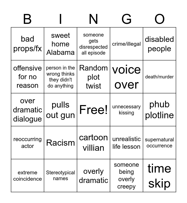 This bingo card has a free space and 24 words: Racism, Stereotypical names, Random plot twist, extreme coincidence, disabled people, bad props/fx, offensive for no reason, sweet home Alabama, unnecessary kissing, cartoon villian, voice over, over dramatic dialogue, unrealistic life lesson, supernatural occurrence, person in the wrong thinks they didn't do anything, someone being overly creepy, phub plotline, someone gets disrespected all episode, death/murder, pulls out gun, time skip, reoccurring actor, crime/illegal and overly dramatic.