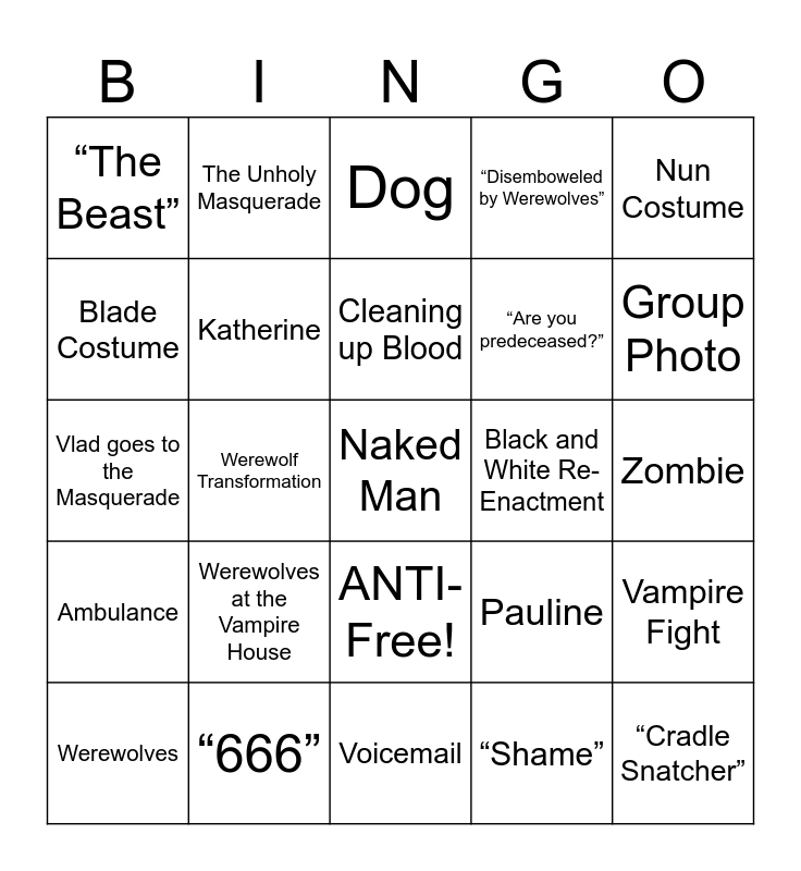 This bingo card has 26 words: ANTI-Free!, “Shame”, Cleaning up Blood, “666”, Nun Costume, “The Beast”, Blade Costume, The Unholy Masquerade, Zombie, Pauline, “Are you predeceased?”, Vlad goes to the Masquerade, Vampire Fight, Werewolves, Werewolf Transformation, Cameraman is Attacked, “Disemboweled by Werewolves”, Ambulance, Dog, Naked Man, Group Photo, Voicemail, Black and White Re-Enactment, Werewolves at the Vampire House, Katherine and “Cradle Snatcher”.