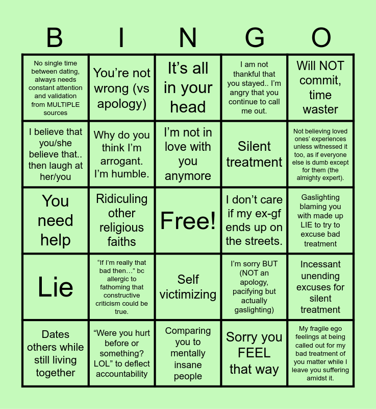 This bingo card has a free space and 24 words: “If I’m really that bad then…” bc allergic to fathoming that constructive criticism could be true., “Were you hurt before or something? LOL” to deflect accountability, I’m not in love with you anymore, Dates others while still living together, Will NOT commit, time waster, No single time between dating, always needs constant attention and validation from MULTIPLE sources, I believe that you/she believe that.. then laugh at her/you, You’re not wrong (vs apology), I don’t care if my ex-gf ends up on the streets., Self victimizing, Silent treatment, You need help, I’m sorry BUT (NOT an apology, pacifying but actually gaslighting), Incessant unending excuses for silent treatment, Why do you think I’m arrogant. I’m humble., Sorry you FEEL that way, Gaslighting blaming you with made up LIE to try to excuse bad treatment, It’s all in your head, Not believing loved ones’ experiences unless witnessed it too, as if everyone else is dumb except for them (the almighty expert)., Ridiculing other religious faiths, My fragile ego feelings at being called out for my bad treatment of you matter while I leave you suffering amidst it., Lie, I am not thankful that you stayed.. I’m angry that you continue to call me out. and Comparing you to mentally insane people.