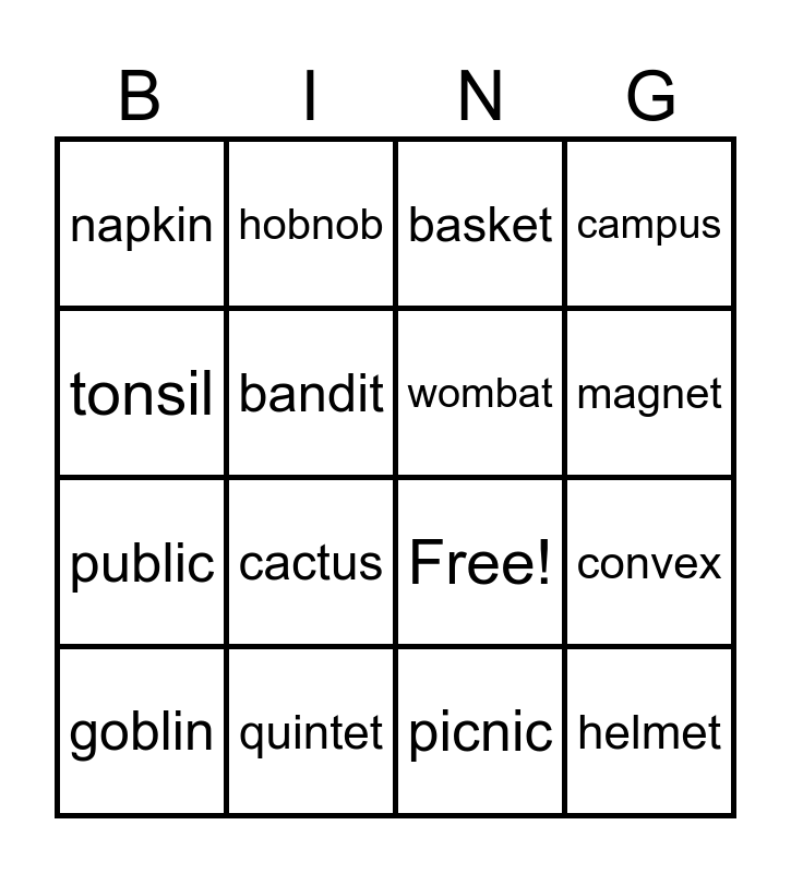 This bingo card has 21 words: quintet, velvet, hobnob, tablet, picnic, wombat, napkin, basket, Free!, magnet, public, campus, helmet, tidbit, bandit, publish, goblin, cactus, tonsil, convex and vanquish.