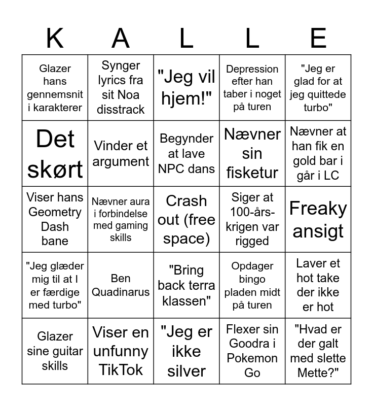 This bingo card has a free space and 24 words: Ben Quadinarus, Viser en unfunny TikTok, Begynder at lave NPC dans, Glazer sine guitar skills, "Jeg er glad for at jeg quittede turbo", Glazer hans gennemsnit i karakterer, Det skørt, Synger lyrics fra sit Noa disstrack, Siger at 100-års-krigen var rigged, "Bring back terra klassen", Nævner sin fisketur, Viser hans Geometry Dash bane, Opdager bingo pladen midt på turen, Laver et hot take der ikke er hot, Vinder et argument, Flexer sin Goodra i Pokemon Go, Freaky ansigt, "Jeg vil hjem!", Nævner at han fik en gold bar i går i LC, Nævner aura i forbindelse med gaming skills, "Hvad er der galt med slette Mette?", "Jeg glæder mig til at I er færdige med turbo", Depression efter han taber i noget på turen and "Jeg er ikke silver.