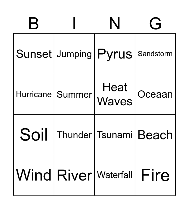 This bingo card has 32 words: Air, Avalanche, Beach, Equator, Fire, Heat Waves, Hurricane, Ice, Jumping, Mountains, Oceaan, Pyrus, Rain, Rainbow, River, lava, Tides, Tsunami, Turbulence, Turn the tide, Wageningen, Water lily, Waterfall, Waves, Wind, Sandstorm, Soil, Summer, Sunset, Sunshine, Temperature and Thunder.