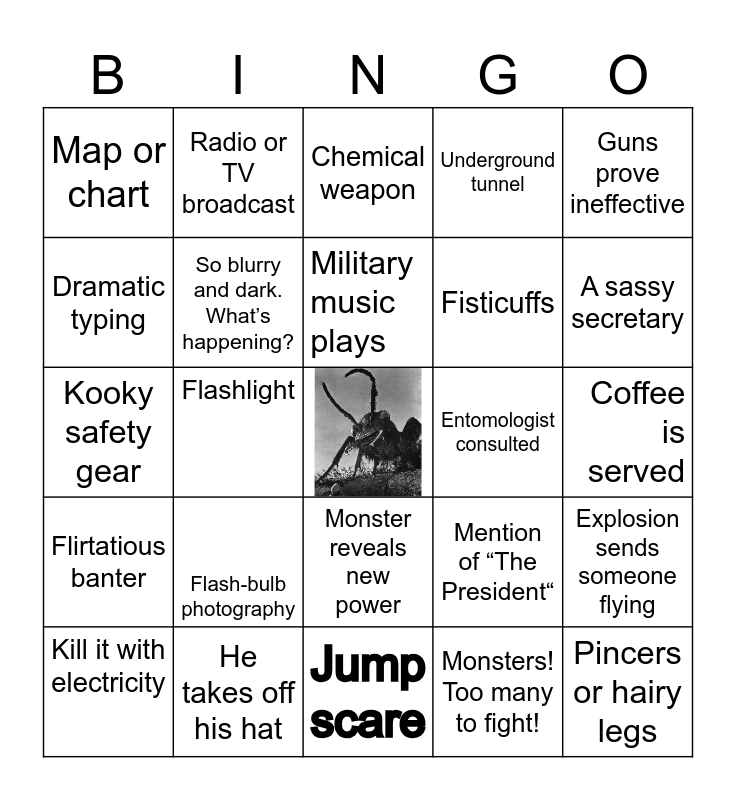 This bingo card has a free space and 24 words: Flash-bulb photography, He takes off his hat, Military music plays, Kill it with electricity, Guns prove ineffective, Map or chart, Dramatic typing, Radio or TV broadcast, Entomologist consulted, Monster reveals new power, Fisticuffs, Kooky safety gear, Mention of “The President“, Explosion sends someone flying, So blurry and dark. What’s happening?, Monsters! Too many to fight!, Coffee is served, Chemical weapon, A sassy secretary, Flashlight, Pincers or hairy legs, Flirtatious banter, Underground tunnel and Jump scare.