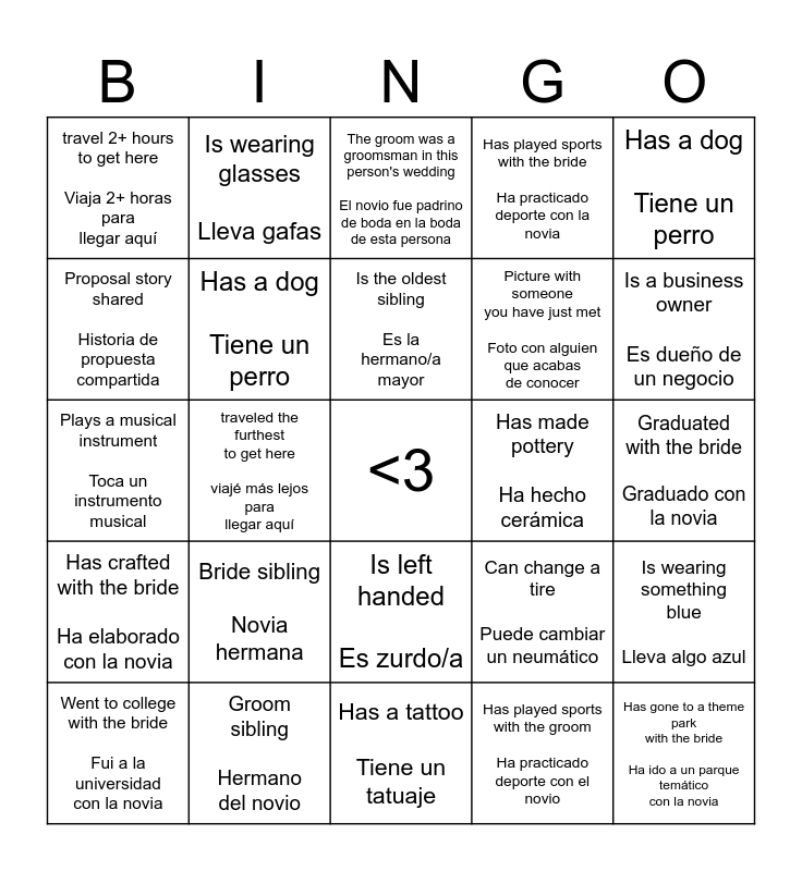 This bingo card has a free space and 44 words: Lived with the bride Vivió con la novia, Has gone to a theme park with the bride Ha ido a un parque temático con la novia, Has known the bride for 20+ years Conocía a la novia desde hacía más de 20 años, Went to college with the bride Fui a la universidad con la novia, Wears your shoe size Usa tu talla de calzado, Has played sports with the groom Ha practicado deporte con el novio, The groom was a groomsman in this person's wedding El novio fue padrino de boda en la boda de esta persona, The bride was a bridesmaid in this person's wedding... La novia fue dama de honor en la boda de esta persona, Has a dog Tiene un perro, Groom sibling Hermano del novio, Has played sports with the bride Ha practicado deporte con la novia, Has made pottery Ha hecho cerámica, Is left handed Es zurdo/a, Bride sibling Novia hermana, Has a motorcycle Tiene una motocicleta, Has a tattoo Tiene un tatuaje, Has met someone famous Ha conocido a alguien famoso/a, Plays a musical instrument Toca un instrumento musical, Has 3+ children Tiene 3+ hijos, Is a business owner Es dueño de un negocio, Is wearing glasses Lleva gafas, can speak 1+ languages Puede hablar 1+ idiomas, Doesn't drink coffee No bebe café, travel 2+ hours to get here Viaja 2+ horas para llegar aquí, Has been camping with the bride and groom Estuvo acampando con los novios, Graduated with the bride Graduado con la novia, Is the youngest in their family Es el/la más joven de su familia, Has been on tv Ha estado en la televisión, Can change a tire Puede cambiar un neumático, Has crafted with the bride Ha elaborado con la novia, Is wearing something borrowed Lleva algo prestado, Is wearing something blue Lleva algo azul, Has played a board game with the groom Ha jugado un juego de mesa con el novio, Has a cat Tiene un gato, traveled the furthest to get here viajé más lejos para llegar aquí, Has been to 3 weddings this year Ha estado en 3 bodas este año, has run a marathon ha corrido un maratón, Has a garden Tiene un jardín, Is the oldest sibling Es la hermano/a mayor, Proposal story shared Historia de propuesta compartida, Picture with someone you have just met Foto con alguien que acabas de conocer, Someone mentions the wedding date Alguien menciona la fecha de la boda, Has a dog Tiene un perro and Doesn't like tea No le gusta el té.