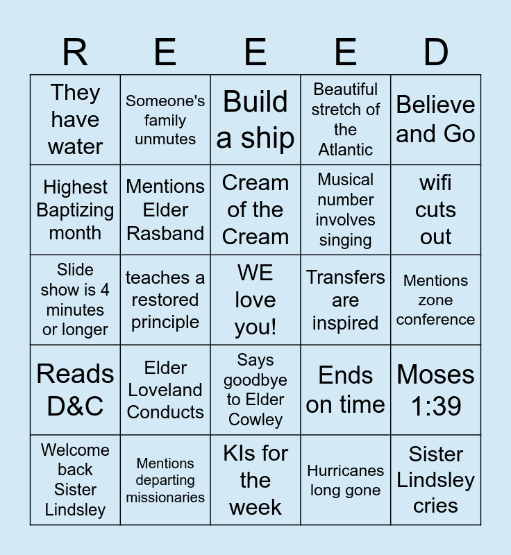This bingo card has a free space and 24 words: Elder Loveland Conducts, Mentions departing missionaries, Cream of the Cream, Welcome back Sister Lindsley, Believe and Go, They have water, Highest Baptizing month, Someone's family unmutes, Transfers are inspired, Says goodbye to Elder Cowley, Musical number involves singing, Slide show is 4 minutes or longer, Ends on time, Moses 1:39, Mentions Elder Rasband, Hurricanes long gone, Mentions zone conference, Build a ship, wifi cuts out, teaches a restored principle, Sister Lindsley cries, Reads D&C, Beautiful stretch of the Atlantic and KIs for the week.