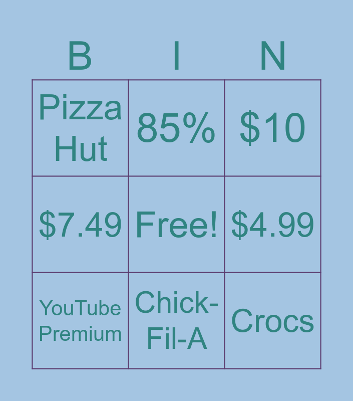 This bingo card has a free space and 17 words: Apple, Spotify, $10, Pizza Hut, Target, $7.49, Hulu, YouTube Premium, Chick-Fil-A, $4.99, 15%, 10%, Crocs, 85%, Levi's, Fenty and HP.