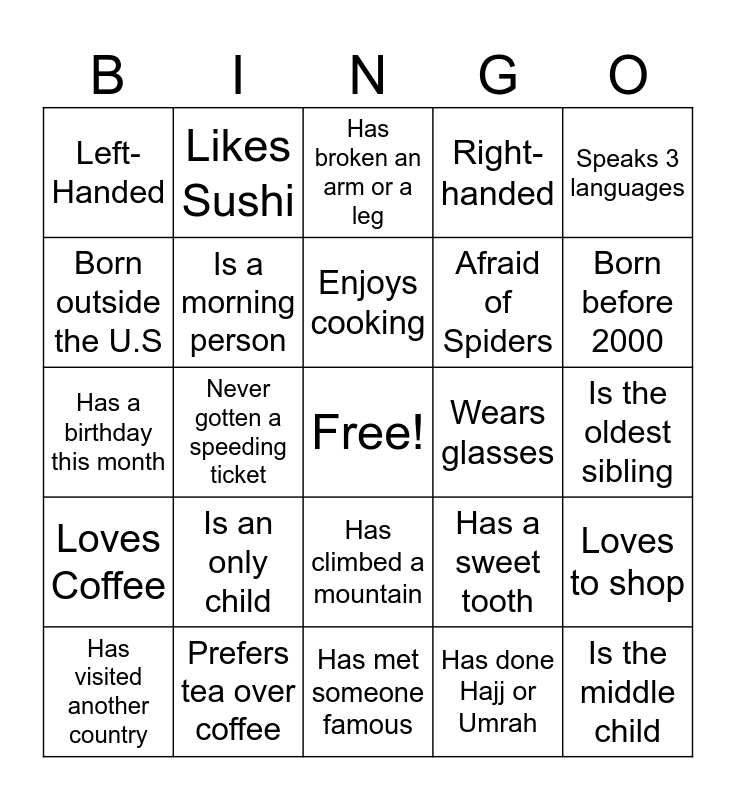 This bingo card has a free space and 24 words: Is an only child, Prefers tea over coffee, Enjoys cooking, Has visited another country, Speaks 3 languages, Left-Handed, Born outside the U.S, Likes Sushi, Wears glasses, Has climbed a mountain, Afraid of Spiders, Has a birthday this month, Has a sweet tooth, Loves to shop, Is a morning person, Has done Hajj or Umrah, Is the oldest sibling, Has broken an arm or a leg, Born before 2000, Never gotten a speeding ticket, Is the middle child, Loves Coffee, Right-handed and Has met someone famous.