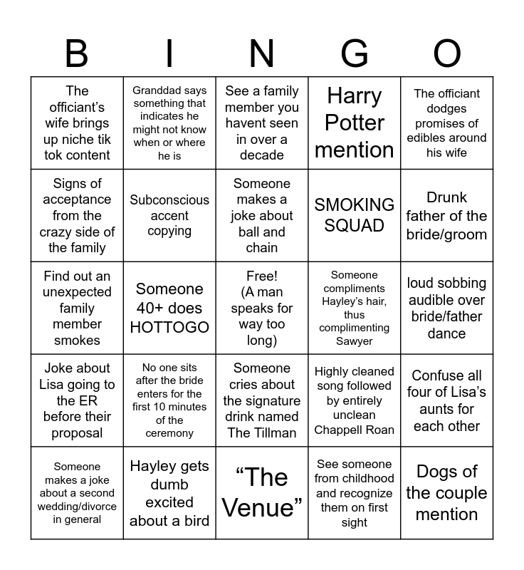 This bingo card has a free space and 24 words: No one sits after the bride enters for the first 10 minutes of the ceremony, Hayley gets dumb excited about a bird, Someone makes a joke about ball and chain, Someone makes a joke about a second wedding/divorce in general, The officiant dodges promises of edibles around his wife, The officiant’s wife brings up niche tik tok content, Signs of acceptance from the crazy side of the family, Granddad says something that indicates he might not know when or where he is, Someone compliments Hayley’s hair, thus complimenting Sawyer, Someone cries about the signature drink named The Tillman, SMOKING SQUAD, Find out an unexpected family member smokes, Highly cleaned song followed by entirely unclean Chappell Roan, Confuse all four of Lisa’s aunts for each other, Subconscious accent copying, See someone from childhood and recognize them on first sight, loud sobbing audible over bride/father dance, See a family member you havent seen in over a decade, Drunk father of the bride/groom, Someone 40+ does HOTTOGO, Dogs of the couple mention, Joke about Lisa going to the ER before their proposal, Harry Potter mention and “The Venue”.
