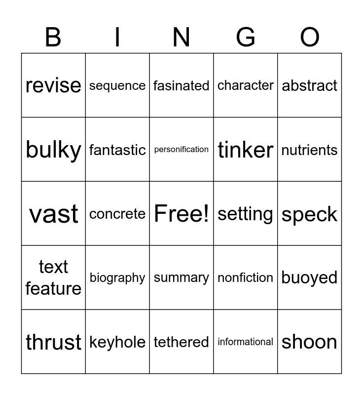 This bingo card has a free space and 24 words: biography, keyhole, personification, thrust, abstract, revise, bulky, sequence, setting, summary, tinker, vast, nonfiction, buoyed, fantastic, informational, speck, fasinated, nutrients, concrete, shoon, text feature, character and tethered.