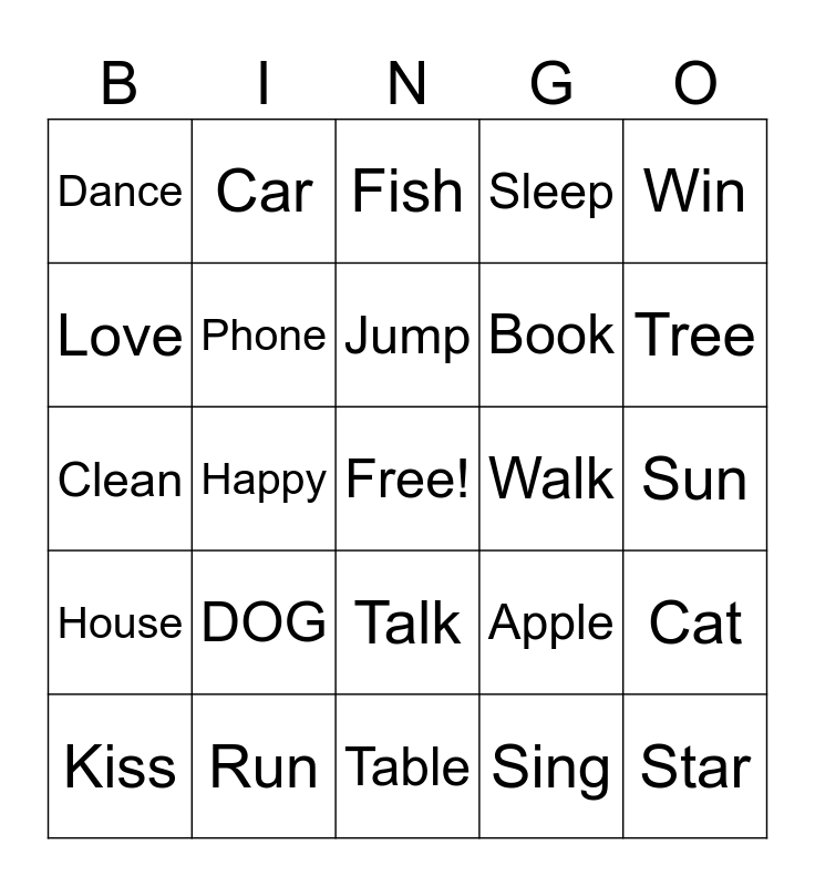 This bingo card has a free space and 24 words: DOG, Run, Jump, Kiss, Win, Dance, Love, Car, Walk, Talk, Book, Clean, Apple, Cat, Phone, Sing, Sun, Fish, Tree, Happy, Star, House, Sleep and Table.