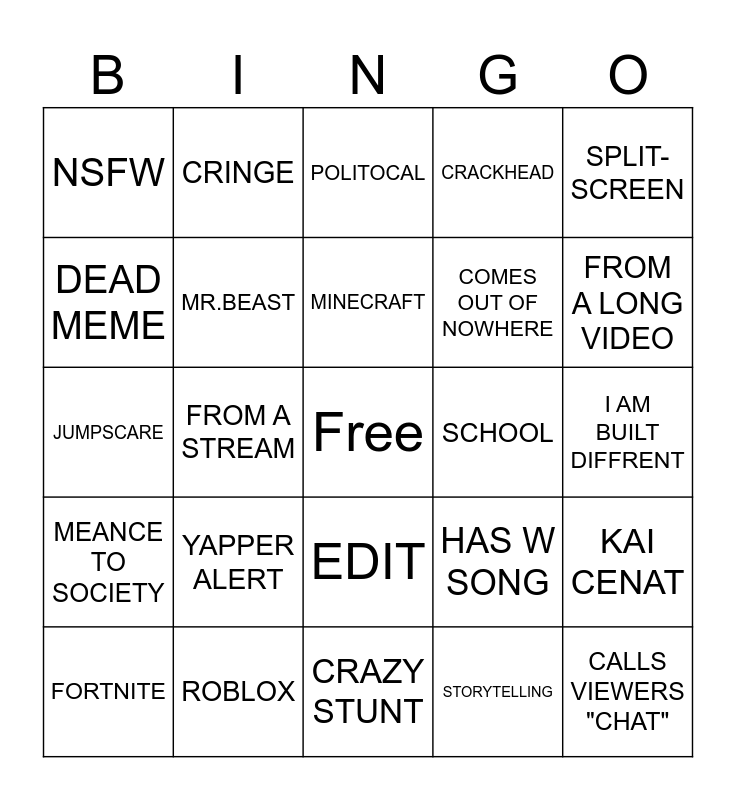 This bingo card has a free space and 24 words: YAPPER ALERT, ROBLOX, MINECRAFT, FORTNITE, SPLIT-SCREEN, NSFW, DEAD MEME, CRINGE, SCHOOL, EDIT, COMES OUT OF NOWHERE, JUMPSCARE, HAS W SONG, KAI CENAT, MR.BEAST, STORYTELLING, I AM BUILT DIFFRENT, POLITOCAL, FROM A LONG VIDEO, FROM A STREAM, CALLS VIEWERS "CHAT", MEANCE TO SOCIETY, CRACKHEAD and CRAZY STUNT.