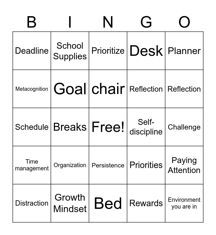 This bingo card has a free space and 29 words: Distraction, Focus, Breaks, Routine, Deadline, Prioritize, Goal, Organization, Self-discipline, Growth Mindset, Challenge, Environment you are in, Bed, Rewards, Reflection, Positive, Persistence, Time management, Planner, Schedule, Priorities, Checklist or To Do List, Reflection, Metacognition, Desk, School Supplies, Paying Attention, chair and Lighting.
