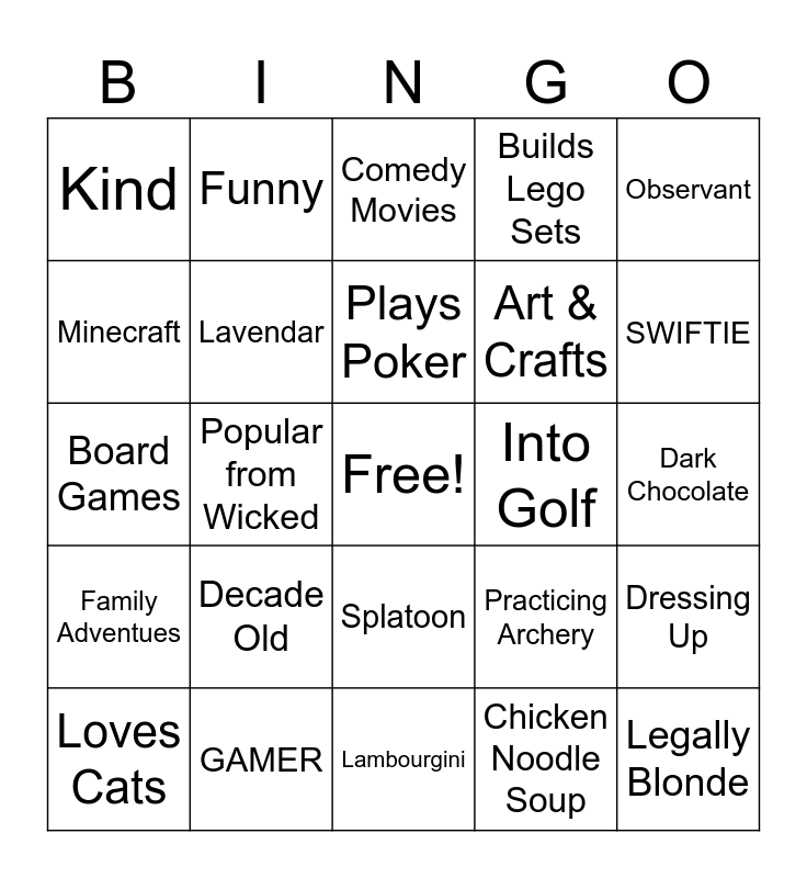 This bingo card has a free space and 24 words: Decade Old, GAMER, Plays Poker, Loves Cats, Observant, Kind, Minecraft, Funny, Into Golf, Splatoon, Art & Crafts, Board Games, Practicing Archery, Dressing Up, Lavendar, Chicken Noodle Soup, Dark Chocolate, Comedy Movies, SWIFTIE, Popular from Wicked, Legally Blonde, Family Adventues, Builds Lego Sets and Lambourgini.