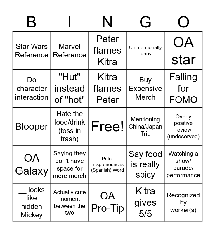 This bingo card has a free space and 39 words: __ looks like Gizmo or Pixel (or dogs referenced), White Claw spotted, Doesn't taste like it has alcohol, "Hut" instead of "hot", __ looks like hidden Mickey, Peter mispronounces (Spanish) Word, Kitra flames Peter, Run into other Youtubers, OA star, OA Galaxy, Hate the food/drink (toss in trash), Unintentionally funny, Recognized by worker(s), Overly positive review (undeserved), Mentioning China/Japan Trip, Saying they don't have space for more merch, "It's your color" for anything Lime Green to Peter, Star Wars Reference, Food is melting or spilling, Say food is really spicy, Do character interaction, OA Pro-Tip, Buy Expensive Merch, Falling for FOMO, Kitra being a weenie, Kitra gets Turnt, Kitra cries, Loungefly, Try weird food, Marvel Reference, Cringe Moment Witnessed, Get Overpriced / Expensive Food, Peter flames Kitra, Actually cute moment between the two, Kitra gives 5/5, Connoisseur/ Aficionado, Watching a show/ parade/ performance, Blooper and Bougie Activities.