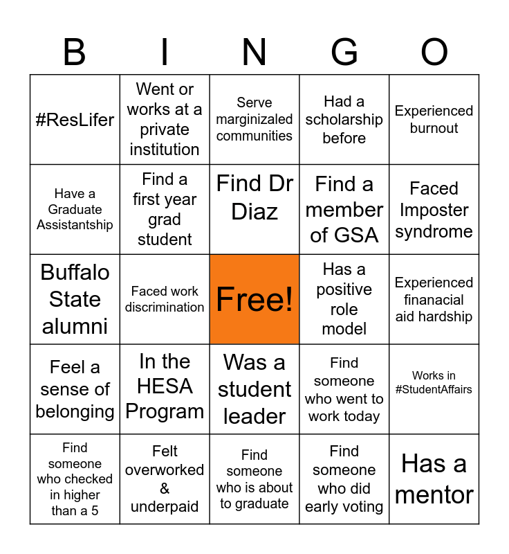 This bingo card has a free space and 24 words: In the HESA Program, Felt overworked & underpaid, Find Dr Diaz, Find someone who checked in higher than a 5, Experienced burnout, #ResLifer, Have a Graduate Assistantship, Went or works at a private institution, Has a positive role model, Was a student leader, Find a member of GSA, Buffalo State alumni, Find someone who went to work today, Works in #StudentAffairs, Find a first year grad student, Find someone who did early voting, Experienced finanacial aid hardship, Serve marginizaled communities, Faced Imposter syndrome, Faced work discrimination, Has a mentor, Feel a sense of belonging, Had a scholarship before and Find someone who is about to graduate.